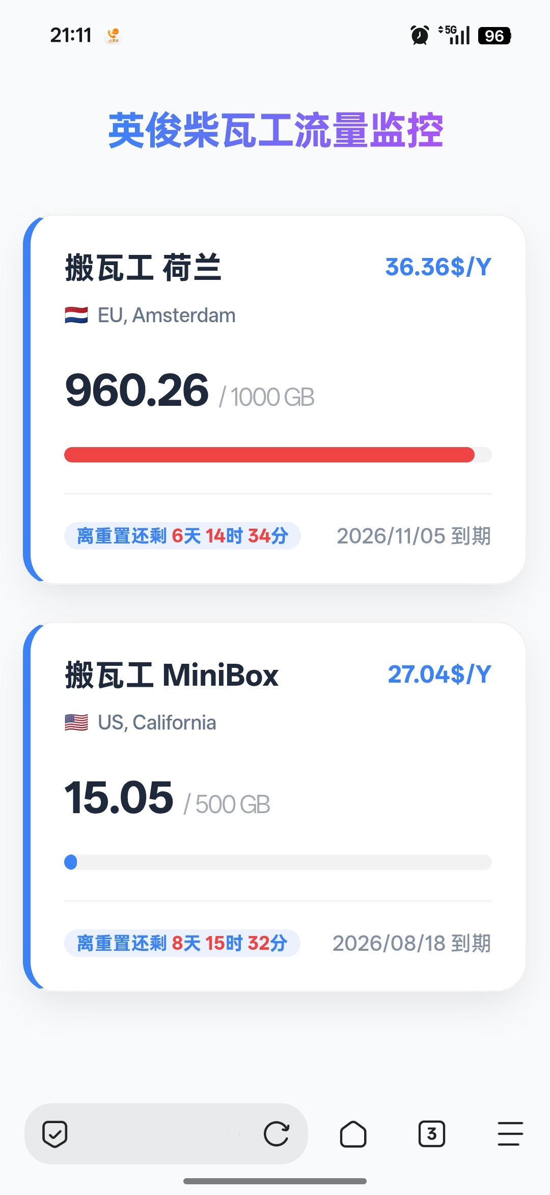 搬瓦工iOS上的BWHbox挺好用,但移动端体验一直差点意思。作为“流量焦虑症”玩家,必须随时掌握流量动态,不然本博客和图片将不够挥霍了。与其在浏览器里手忙脚乱的访问官网,不如自己手搓一个全链路加密的监控看板。